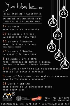 La exposición estará abierta en horario regular desde el viernes 17 de abril de 2015 hasta el domingo 23 de agosto de 2015, para el disfrute del público en la Sala Miguel Antonio Ferrer, 4to piso MAPR. Costo varia según la actividad.